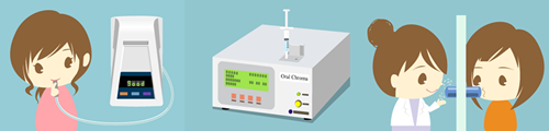 これは、機械で口の中の臭い成分を数値化して調べる検査法で口の中の細菌が出す硫化水素や歯周病菌のメチルメルカプタン、内臓疾患などがあるときに出るジメチルスルフィドという、口臭の原因となる3つのガスを分析します。
